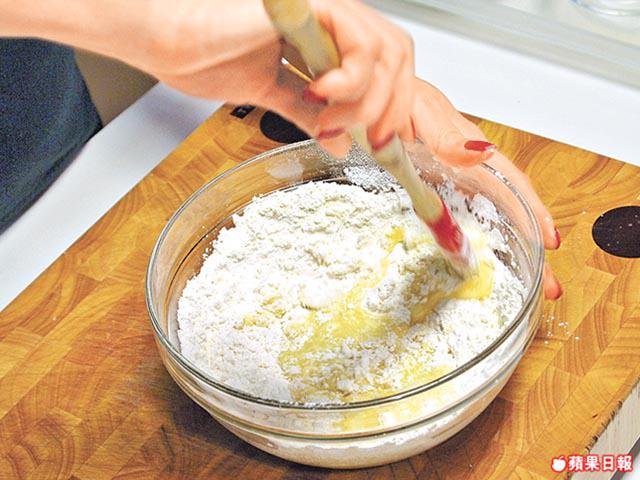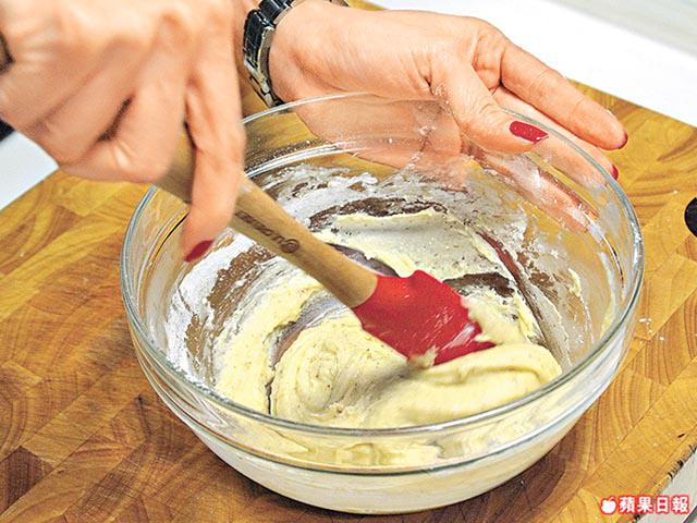 2.繼續分數次加入蛋漿,每次打勻,拌成麪糰。