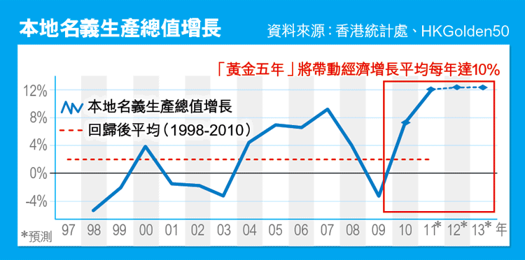 在全球發達國家人口老化、經濟發展減緩下,這本是自然不過的事。可是香港在黃金五年的處境與世界各國都不一樣,我們正經歷舉世無雙的第二次高增長期。過去十年名義增長年均為2%,黃金五年中則會是10%以上;過往十年通脹為零,黃金五年則會是5-8%……這些數字反映未來幾年香港的經濟面貌將與過去迴然不同。
