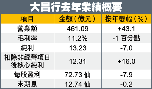 【本報訊】大昌行(1828)公佈截至去年底止全年業績,扣除所有非經營收益,核心純利僅得12.31億元,按年增長16%,不但較上半年度增長大幅放緩,更遠差過市場預期的中位數15.5億元,主因去年第四季汽車銷售急跌有關。公司股價在昨日中午公佈業績後即大幅下挫,全日瀉13.75%收市。