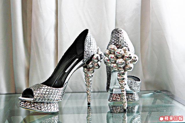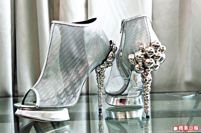 鞋履則為品牌天馬行空的思維,有metallic曲線裝飾的銀色高跟鞋,也有立體球狀跟部的peepheels,都是帶點科幻雕塑美。