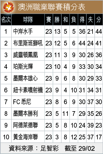 阿德萊德聯上仗不敵紐卡素噴射機,聯賽兩連敗,距離聯賽前6的季後賽資格達8分,而餘下常規賽只得4場,阿聯要取季賽後資格實在渺茫;事實上下周中亞冠盃分組賽展開,阿聯要作客烏茲別克的賓約哥,以亞冠盃豐富的獎金的吸引力,阿聯可以預期重視亞冠盃多於聯賽,而且主隊陣中仍有迪利夫斯基、米蘭蘇沙克等傷兵,雖然烏拉圭中場烏素卡可克服大腿傷上陣,但以近期球隊脆弱的防守力,實不足信。