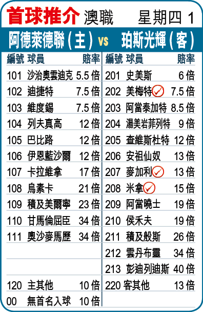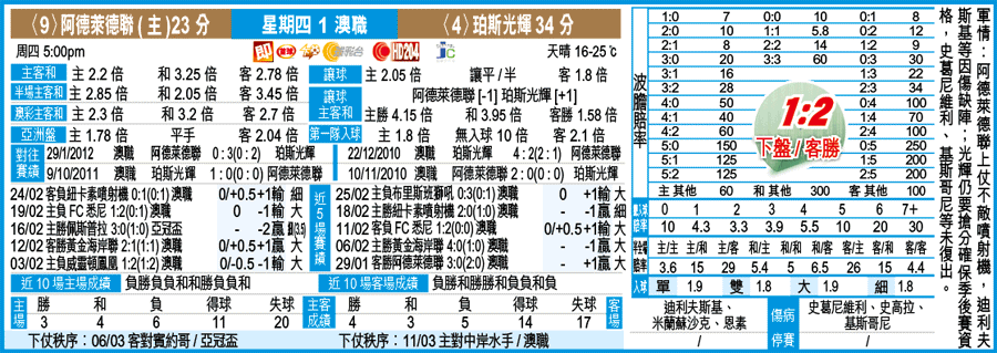 因阿德萊德聯下周中要參戰亞冠盃分組賽,今周主場對珀斯光輝的澳職聯賽提早於周四舉行;以阿聯季後賽資格渺茫,重視亞冠盃多於聯賽,今仗讓唔起光輝,客軍受讓平/半宜取下盤。(球賽編號:星期四1;有線64及204台今日5:00pm直播)文:牽牛