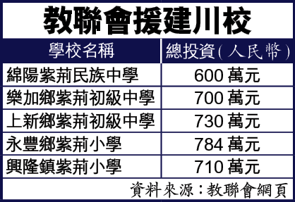 教聯會在川震後,向本港學界籌得近900多萬港元,再向港府「支援四川地震災區重建工作信託基金」(下稱信託基金)申撥1,000萬元,支援四川五間中小學重建,都以「紫荊」命名,綿陽紫荊民族中學其中之一(見表)。興建五間學校總費約4,300萬港元(人民幣3,500萬元),當中近一半來自本港捐款及港府援川基金。