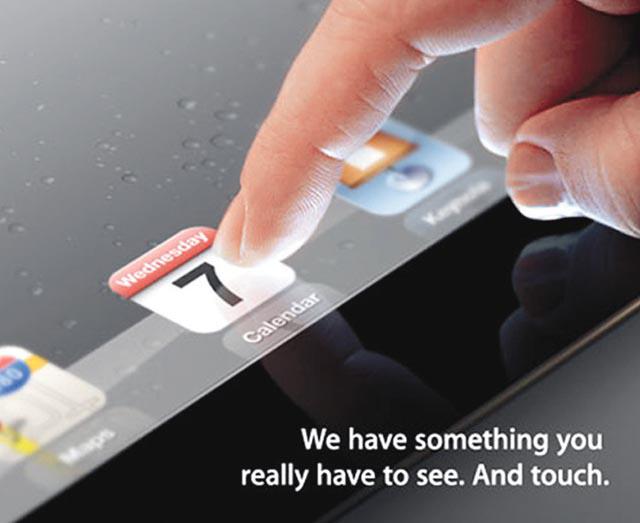 蘋果在邀請函郵件上,貫徹蘋果的神秘風格,只寫着「我們有些你很想看和觸摸的東西」,並附有輕觸式屏幕的配圖,但隻字不提iPad3。
