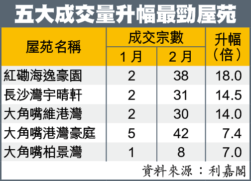 利嘉閣總裁廖偉強表示,樓市經過三個季度尋底後喘定,該行綜合全港50個屋苑,2月錄2113宗成交,較1月506宗激增三倍,創近13個月新高。當中,以紅磡海逸豪園成交最大躍進,由1月僅兩宗勁升上月38宗,急升18倍。整體樓價回升2.3%,終止七個月樓價尋底局面。