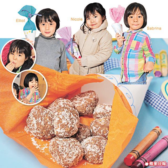 做朱古力球先將瑪利餅放入密實袋內壓碎,有時用麪棍、有時用手,總之餅乾越碎越好!弄碎後Joanne拿起可可粉問大家是甚麼,外國小男孩Elliot說是Chocolate,原來是錯!大師姐Chloe立即補充是CocoaPowder,將這個CocoaPowder混入餅碎、煉奶,然後便到難度最高的步驟,搓朱古力球了!各父母細心地教小朋友把朱古力搓圓,小朋友一開始還是雞手鴨腳,誰不知過了一會立即玩得不亦樂乎,更大玩DirtyHighFive。玩過後,小朋友便用椰絲包裹着朱古力球。別以為這就完結,小朋友們還要用卡紙及縐紙製作包裝,名副其實一手包辦,最後大家才高高興興地把自己的作品帶回家!