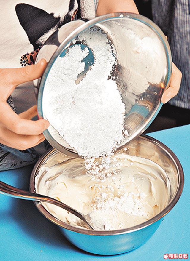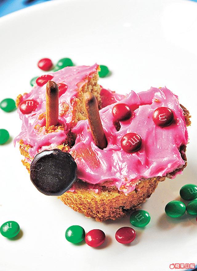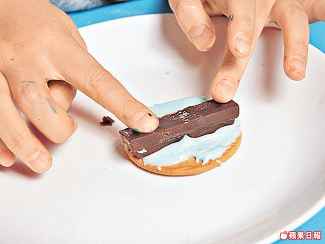 小朋友最愛吃曲奇餅,貪其香脆又可口,作為廿四孝媽媽不妨親手做一些曲奇餅,然後讓子女發揮創意,變身成小蜜蜂!先將牛油、砂糖拌勻,加蛋黃、呍呢拿香油、麪粉拌勻,放在焗盆上,放入預熱至180℃焗爐中,焗12-15分鐘即可出爐。將裝飾糖霜材料拌勻,抹在曲奇上,加上朱古力條成蜜蜂身,在兩旁放上棉花糖,再在朱古力條上唧上糖霜成花紋即可。若果無焗爐,Joanne老師教大家以瑪利餅代替即可。