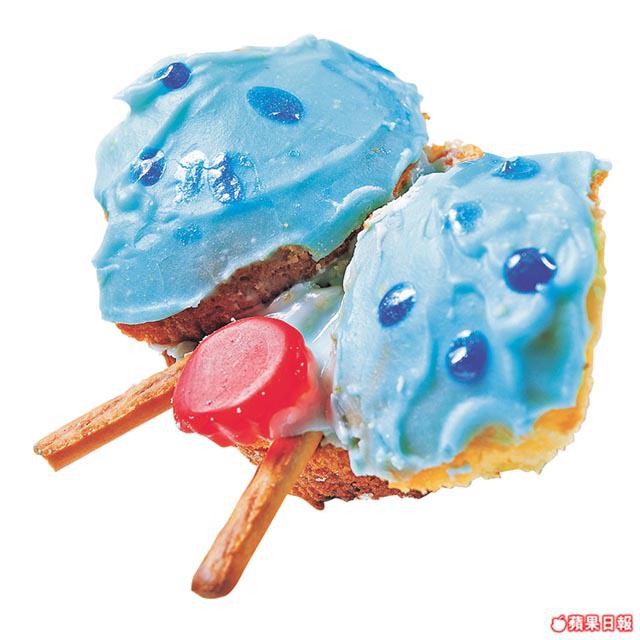 材料:蛋糕12個、藍色食用糖漿/ 百力滋/軟糖各適量