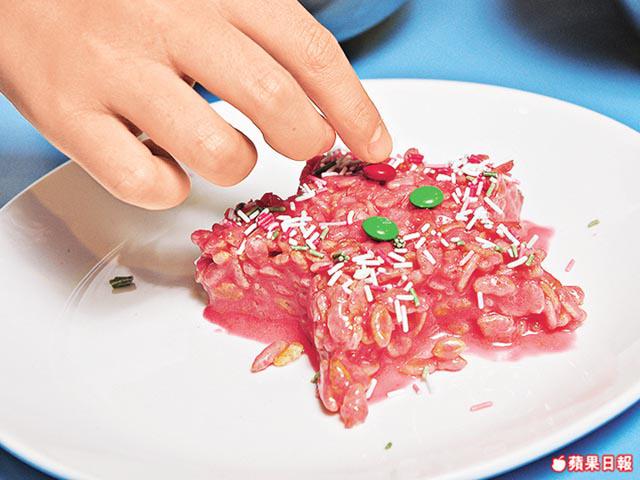 這個脆米餅很容易做,只要將牛油、棉花糖隔熱水坐溶拌勻,加入食用色素,拌入脆米,倒入星形模具內壓實,脫模後放上朱古力豆作裝飾即可。小廚神Chloe今次做了個笑哈哈圖案,有姿勢又有實際!