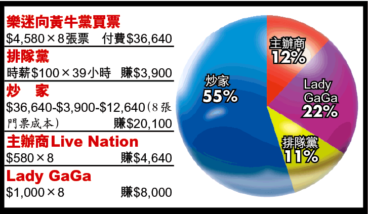 至於主辦商LiveNation,估計一張1,580元門票可獲580元,8張門票則獲4,640元,而GaGa則收門票餘下的1,000元,8張門票即獲8,000元,故以一名排隊黨購買8張門票計,炒家所賺的錢要比GaGa還多!而排隊黨所賺的也與主辦商相差不遠,單是8張門票,炒家便有20,000元利潤,若手上有數百門票,利潤數以百萬計!