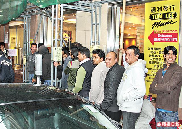 昨在尖沙嘴金馬倫里通利琴行排隊的市民約有80人,除頭幾位是中國人外,大部份是南亞裔人士,部份南亞裔婦女還抱住BB排隊。至下午4時許,通利職員為首50名排隊人士登記身份證號碼,但強調登記後不能離開兼不保證必定買到,其間雖有南亞裔人士互指有人打尖,但有約5名警察維持秩序,未見混亂。而銅鑼灣波斯富街分店因已貼出告示,通告54個籌已派光,故不再見有人龍,部份打算排隊購票的人睇完通告也打道回府。將軍澳新都城分店人龍則被安排在商場以外輪候,傍晚時分有近百人,絕大部份是本地人,有師奶帶同8、9歲兒子一同排隊,但小男孩在旁擔了張凳仔就地做功課。