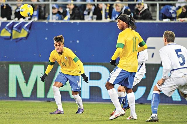 巴西今場前線重用多位在國內效力的球星,但尼馬(左)及朗拿甸奴(中)等表現乏善足陳,在補時階段靠對手的烏龍球,才以2:1險勝波斯尼亞。法新社