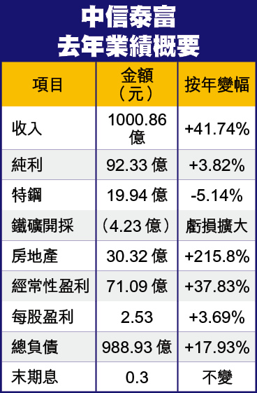 英皇證券分析員殷凱輝指出,中信泰富仍未落實鐵礦今年投資額,但即使8月投產,也只是初步開工,加上鐵礦質素差,開採及運輸成本又高,故對鐵礦石價格的敏感度將相對較高,意味鐵礦未來盈利貢獻難測,加上該公司今年內地樓盤落成量會大減,特鋼價格又難寄厚望,不排除中信泰富今年核心盈利出現倒退。