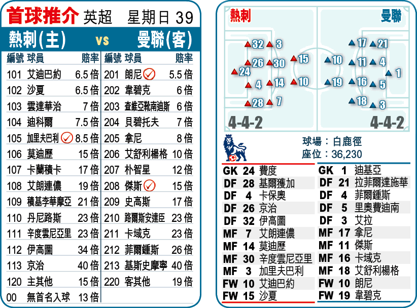 熱刺在英超冠軍之爭已大落後,今晚迎戰曼聯,隨時是見證這支倫敦球會正式退出冠軍爭逐的一戰。曼聯有前鋒朗尼復出,勢破中後場陣容殘缺的熱刺,紅魔鬼客W要捧。(球賽編號:星期日39;有線200及300台明日12