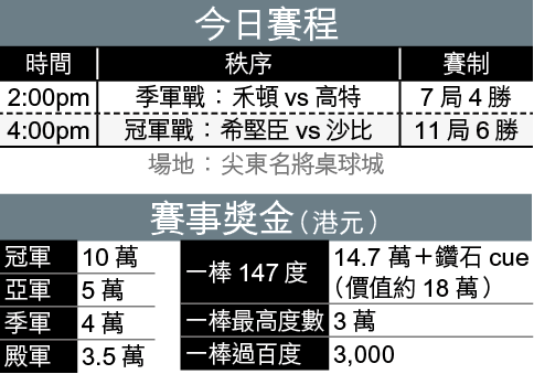 來自倫敦近郊的高特,也大談今夏倫奧,他說最想入場睇保特的100米跑決賽及足球賽:「作為英格蘭球迷,我希望碧咸做奧運隊長,然後在那宣佈退役;他貢獻很多,值得一個好結局。」高特這幾天曾到山頂及蘭桂坊,可惜因大霧而影響景觀。比賽方面,頭場希堅臣以5:2擊敗禾頓,沙比則以5:2贏高特;希堅臣今決賽鬥沙比,高特與禾頓爭季。