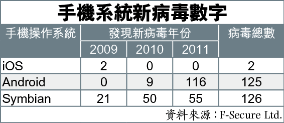 據保安軟件公司F-Secure調查,Android手機病毒源種由2010年的9個,增至去年116個,衍生的變種病毒更達數千個,不少病毒利用Apps傳播。該公司大中華區區域總監李力恒指黑客通常先破解合法軟件後加入木馬病毒,重新上載到第三方平台供下載,「軟件初版冇毒,但上載更新版時會俾人混入病毒」。
