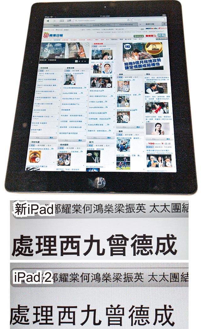 新iPad的色彩飽和度亦較iPad2增加44%,將兩者畫面作比較,明顯看到新iPad的圖示更為圓滑和美觀,文字顯示也有所提高,以《蘋果日報》網實試,新iPad的字體更加黑實及粗邊,視覺效果更貼近打印質素,更加似看書。