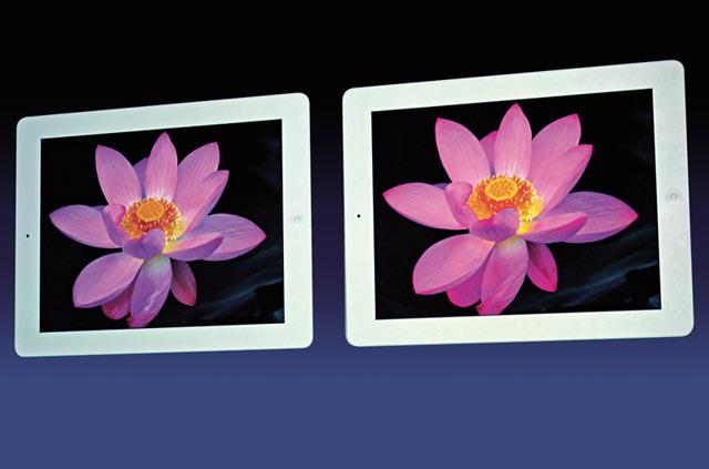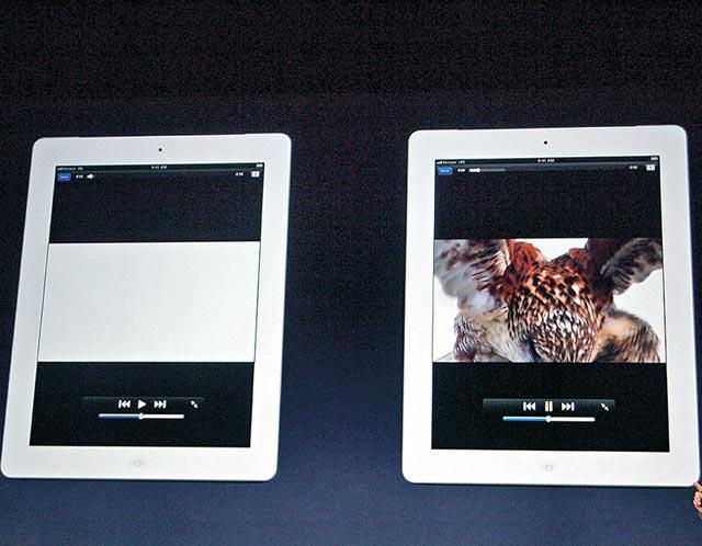 雖然尺寸與iPad2相同,但轉用視網膜顯示技術(Retinadisplay)屏幕的新iPad,顯示質素絕對幾何級上升,9.7吋的Retina屏幕,解像度高達2,048×1,536,比起iPad2的1,024×768,解像度足足高四倍,其310萬像素畫面質素比現時高清電視1080P規格更高,靚過大部分40吋高清電視,可想而知畫面有多精細。