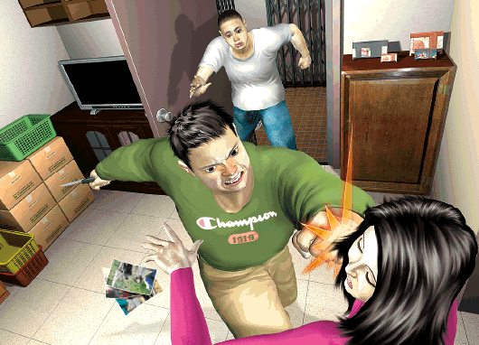 昨凌晨1時許,張陪同女友前往舊愛家,他在門外等候,彭見陸女回來執拾東西,又費盡唇舌箍煲,惟陸女斷然拒絕,彭激動揮拳狂毆,守在門外的張聽到女友慘叫聲,拍門查問:「開門呀!」彭得知情敵就在門外,登時情緒失控,怒執一把蝴蝶刀開門奔出,向張狂捅亂刺。