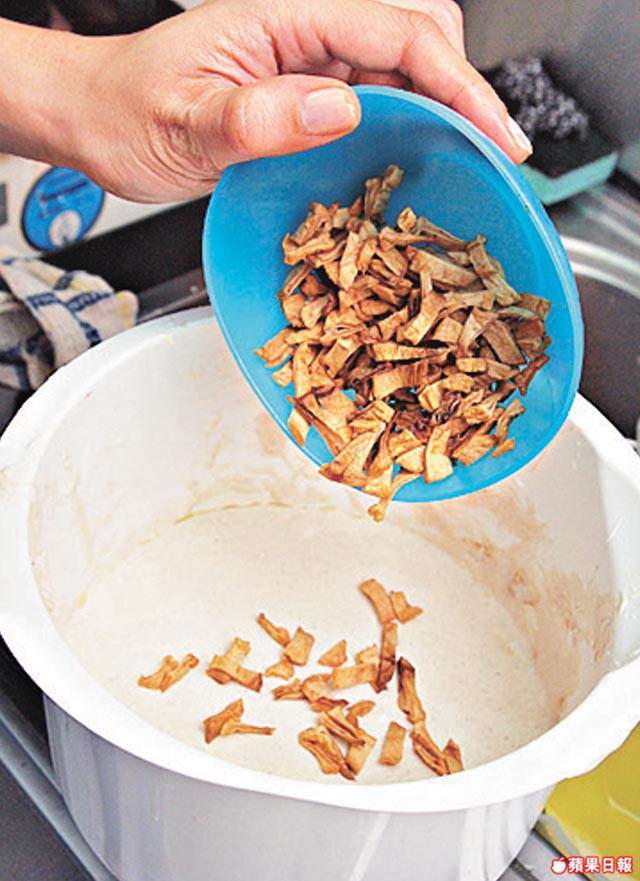 牛奶糖有堅果和牛奶,蛋白質豐富,這款加入蘋果乾的牛奶糖更加極富口感!將100毫升水、70克糖、3/4茶匙鹽、550克水麥芽煮至132℃成砂糖混合物備用,將50克蛋白霜、25克糖、50毫升水以電動打蛋器的高速打成硬身泡泡,慢慢加入砂糖混合物中,拌勻,將電動打蛋器調校至慢速,繼續加入120克奶粉、1湯匙肉桂粉、40克蘋果乾、100克無鹽牛油及300克熟杏仁粒,攪拌成牛奶混合物,並倒在不沾布上,隔着布反覆搓揉,最後放入鋪有牛油紙的盤中,壓平,待稍凉即可切條。牛奶糖糰,必須反覆多次搓揉,做出的牛奶糖才會煙韌!不過記住牛奶糖含豐富脂肪,一次不能吃太多。