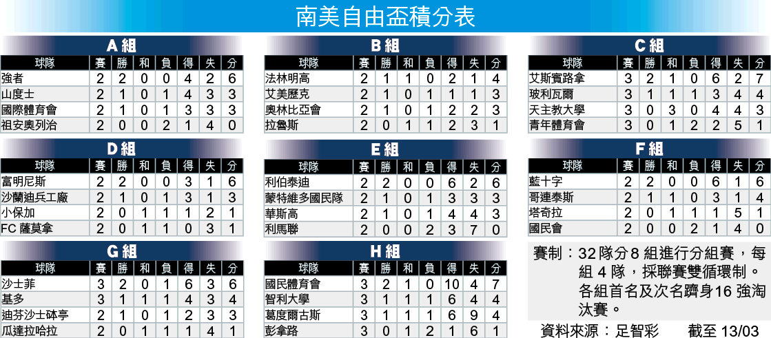 周三南美自由盃組分組賽,F組兩戰全勝的墨西哥球隊藍十字主場迎戰哥連泰斯。上屆巴甲冠軍哥連泰斯保留主力骨幹挑戰新球季,今仗作客藍十字有力取分而回,受讓下更加抵捧,敲[+1]「客勝」。(球賽編號:星期三8;有線61及201台明日9:00am直播)文:何西