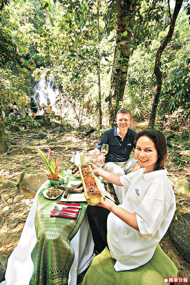 由市場開車約半小時就到達小河入口,聽說那是比侏羅紀歷史還要悠久的森林。瀑布下,他們以河邊的巨石作桌子,早晨婆娑樹影照得桌子上的餐具閃閃發亮,加上後面的大瀑布,呼着清凉空氣很舒服,整個樹林成了私家廚房!大廚會就當天食材,教你煮幾道泰菜。今天的菜單是椰汁龍蝦、三椒炒豬頸肉及大蝦柚子沙律,更重要是教你如何運用餐桌上三十多種香料及調味烹調地道泰菜。晚上還可以在這裏擺成私家餐廳,每晚只接受一個預約,可以做私伙浪漫晚餐或成為秘密派對場地,好多男士訂場作求婚用呢!