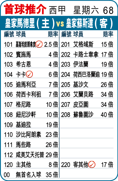 皇家馬德里連失4分,為免崩潰危機加劇,今晚西甲主場迎戰皇家蘇斯達不容再失。皇馬今仗中後場陣容不整,地頭出擊實行傾巢而出搶入球,大炒比數勢重現。有本錢讓兩球下捧皇馬「讓球主客和」[-2]的「主勝」。(球賽編號:星期六68;now632台明日3:00am直播)