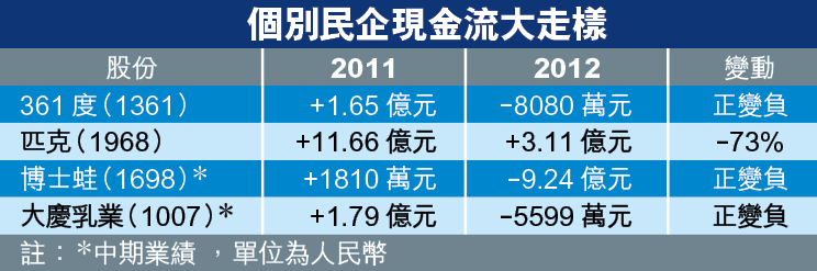 至於上周四開市前停牌的大慶乳業(1007),2011年中期經營現金流,亦由2010年同期的淨流入1.79億元變成淨流出5599萬元。現金流大走樣,去年在體育用品股中較為普遍,361度(1361)去年經營現金流,由前年1.65億元流入變成8080萬元流出;匹克(1968)則由11.66億元大跌至3.11億元,兩股業績公佈後至今,股價個多星期分別累瀉27%及22%。