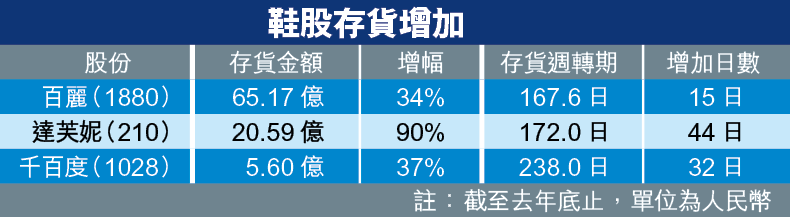 內地體育用品股去年以至今年死因,是去貨慢致存貨激增。今年則輪到鞋股面對清貨問題,勢對銷售構成一定壓力。龍頭鞋股百麗(1880)業績符合預期,但去年業績顯示,期末存貨金額按年升34.1%至65.17億元(人民幣.下同),整體存貨周轉日由152.6日升至167.6日,鞋類業務的周轉日由178.6日升至202日。管理層解釋,去年第四季同店銷售差過預期,導致存貨累積。