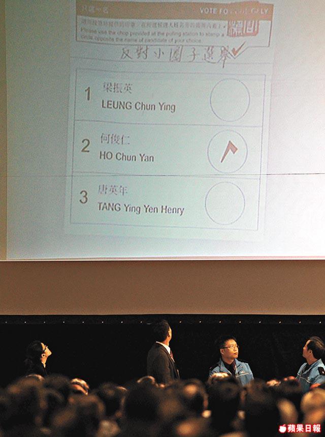 【本報訊】梁振英得票多唐英年一倍以上,昨台上點票員不斷將選票放入1號梁振英的分票箱內,台下梁營支持者高呼「1號、1號,CY(梁振英)好嘢﹗」梁在台上一直胸有成竹,有電視台即場以目測點票,很快已估計梁會當選,唐在點了過半數票時已一臉憔悴,兩者強烈對比。