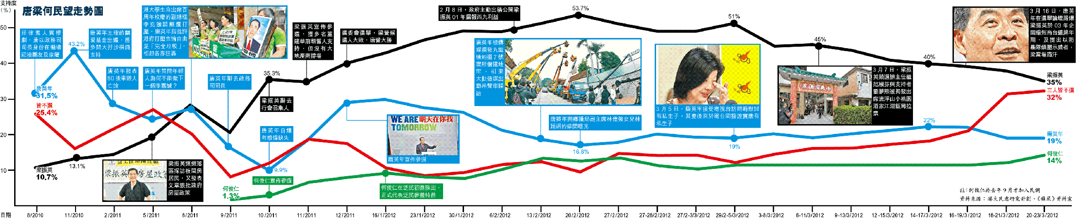 雖然唐英年在選前10天的特首論壇,不惜破壞行政會議保密守則,揭露梁振英於03年企圖以縮短續牌年期打壓商台,及在50萬人參加7.1大遊行後建議出動防暴隊鎮壓示威,為自己贏得不少掌聲,但始終無法挽回民望劣勢。