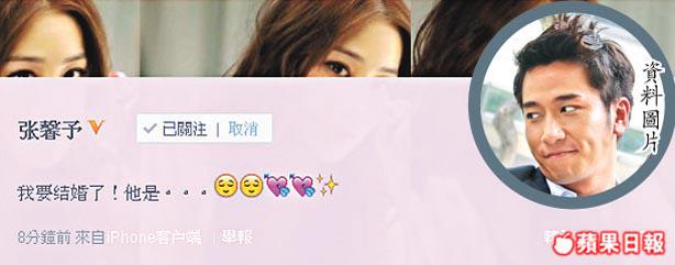 吳卓羲跟35F國產暴乳女神張馨予相戀後,花弗男馬上被治得貼貼服服,繼去年被女友入侵微博貼床照後,張馨予昨日趁愚人節又玩男友,她在微博留言宣佈婚訊:「我要結婚了!他是……」她事後解畫是跟大家開玩笑。剛過25歲生日的張馨予表示就算雙親不停力催,但她最快要2017年才出嫁。
