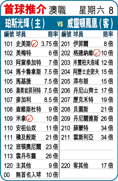 珀斯光輝與威靈頓鳳凰上仗齊齊贏波打入澳職季後賽第2圈,但明顯以光輝較對辦;周六光輝主場對鳳凰,以新西蘭前鋒史美斯的勇態,讓得起鳳凰半/一,上盤出擊。(球賽編號:星期六8;有線64及204台今日5:30pm直播)
