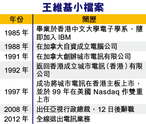 王維基將押注媒體業務,雖未獲發免費電視牌,但城電稱,從公開判決中得悉,廣播事務管理局已向行政會議建議,向城電及另外兩名申請人發牌。城電更預期,多媒體業務明年開始錄得收益,但未來4年於多媒體業務動用資金將不少於25億元。王維基年初接受訪問時曾揚言,做好心理準備在首3至4年要蝕錢。