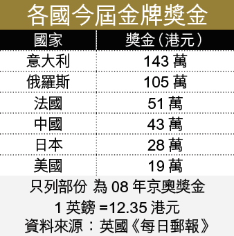 英國奧委會此着看似精明,但實質是在「諗縮數」;意大利在08年京奧時,願意用116,075鎊利誘運動員去衝金(見附表)。英國奧委會今次成功與否,就要看運動員會否被計劃吸引。