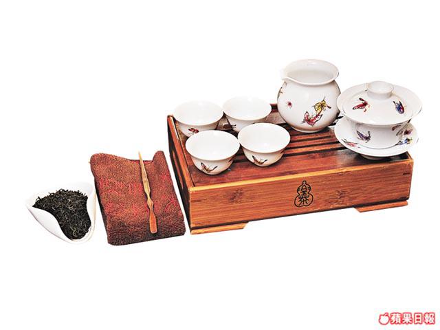 可倒水的茶盤,上有焗盅、公道杯和茶杯,茶葉可放在茶荷裏,並有茶匙和毛巾。