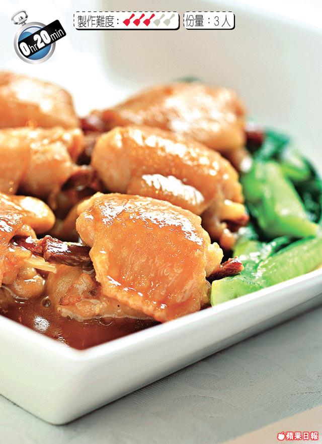 4. 鑊內加紹興酒、二湯、糖、雞粉、蠔油、雞翼、老抽,以中火滾起後,以慢火燜8分鐘,熄火後,加入生粉水埋芡上碟,伴以菜心即可。