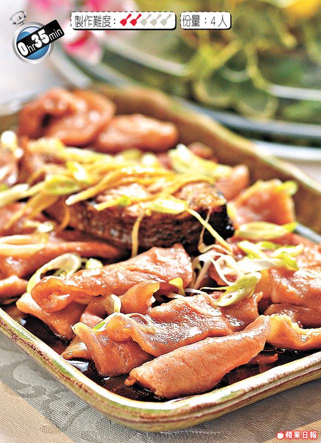 4.碟上先鋪滿肉筋,再放上鹹魚、薑絲,隔水以大火蒸15分鐘,撒上葱花即成。