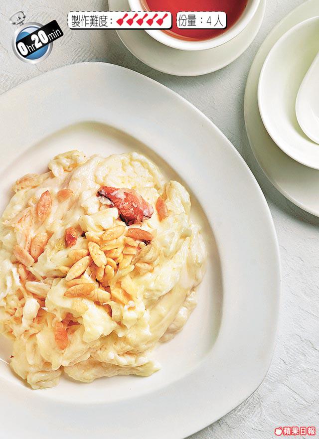 蛋白8両、奶525毫升、熟蟹肉絲11/2両、欖仁少許