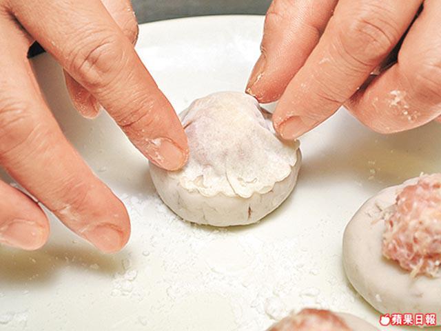 4. 將肉丸放在芋泥上,將白皮沾上蛋白,蓋在肉丸上。