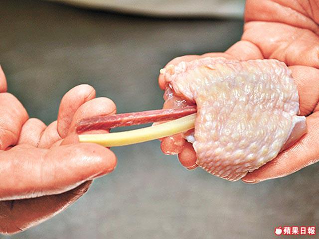2. 雞翼切去兩端,拔出雞骨,釀入冬笋絲、火腿絲。