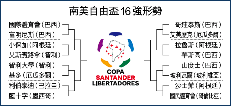 簡評:南美自由盃踏入淘汰賽階段,其有5支巴西球隊打入16強,其中衞冕的山度士編入下線並不易踢,16強對玻利瓦爾外,8強可能面對阿根廷2011年秋季冠軍沙士菲。上線方面,國體會與富明尼斯在首圈已交手,而阿甲傳統班霸小保加,算是上線牌面最高球隊。另外其餘6場首回合賽事將於下周中上演。