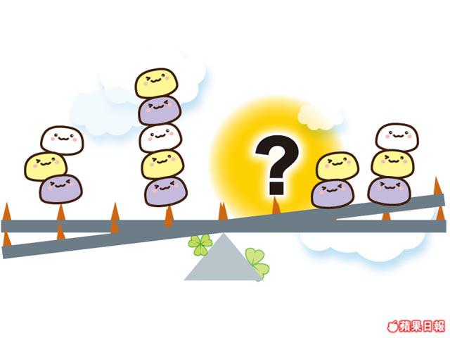 加加蒸了好些小饅頭,個個重量一樣,他用天秤來秤一秤小饅頭,究竟在「?」位置要放上多少個小饅頭,才能使兩邊重量平衡?