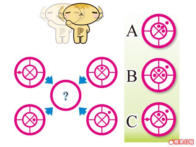 米果透過望遠鏡看到饅頭家族的成員聚集在四個地方,他把四幅影像重叠,即可清楚知道成員們正確的方位。會是右邊哪一幅圖?
