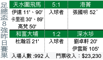 【本報訊】護級失敗的深水埗,昨日在旺角球場上演的足總盃8強戰至加時,爆冷以2:1擊敗上屆亞軍和富大埔躋身4強,下月12日與同日頭場大破港菁的天水圍飛馬爭決賽權。