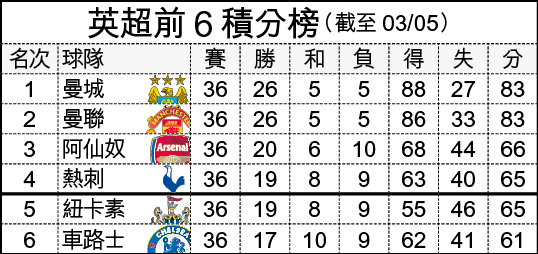 賽後,紐卡素與熱刺同得65分,但得失球差不及後者,屈居第5,相信兩隊會為第4名的歐聯資格鬥到尾。至於車路士得61分排第6,聯賽餘下兩輪,相信爭上第4的機會甚微。領隊迪馬堤奧亦承認:「我們很難以前4名完成賽季,但我們還要繼續努力,直至完全無可能為止!」其實,車路士還有一條生路,只要他們奪得歐聯,便可以衞冕身份自動取得下屆歐聯入場券。文:咖喱