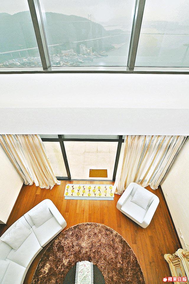 戶戶以複式設計的皇璧,位於荃灣半山悠麗路,外形獨特,是次介紹單位為一伙特大複式戶,面積4,688方呎,罕有5房連4套房間隔,居高臨下,對正藍巴勒海峽、汀九橋及青馬大橋及汲水門大橋「三橋」海景,大廳樓底更有30呎高度,有如置身半空洋房,業主叫價1億元,貴絕同區。