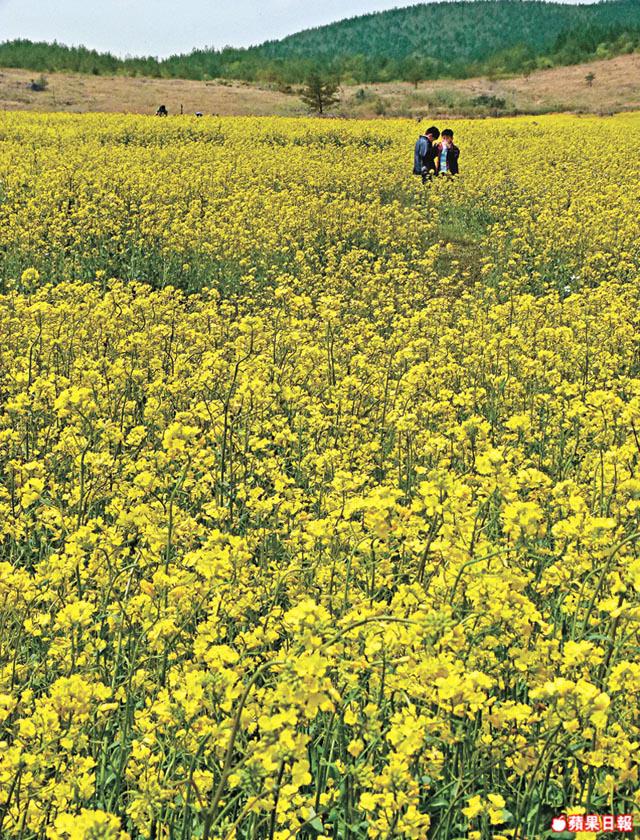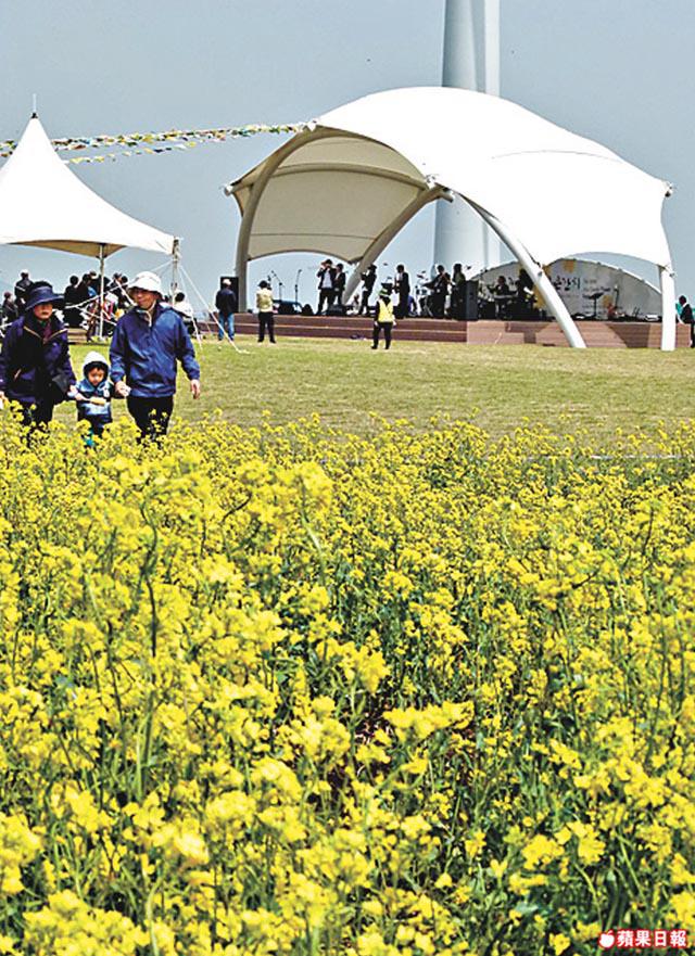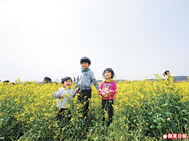 人在綠油油的城山日出峯,我和朋友的面變青了……沒有油菜花怎交差!司機連忙致電問朋友,比手畫腳後車了我們去大鹿山山腳。噢!終於看到連綿不絕的艷黃了!沿路散布着油菜花公園、坡地及牧場等,還有不時舉行的鮮花市集等多種活動。此時油菜花廣場正在開音樂會,由停車場往花田的路上,都是賣韓式街頭小食的攤販,一群阿叔圍在圓桌前,捧着銅小碗,喝着乳白色橘子米酒食串燒。以鹿山路為中心,兩側長10萬公里的風景全是鵝黃一片,遊人半個身體沒入了油菜花海中,風一吹,大片油菜花如被浪翻過般,白色的風車在迴轉,真的猶如一片黃海。
