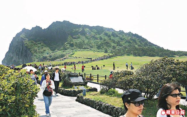 日出前一小時就要出門,到達出名看日出的城山日出峯,是十萬年前的海底火山,爆出現在這個達八萬多坪,一片綠意的城山日出峯。火山口直徑60米、深90米,雖然現在於城山日出峯賞花是泡湯了,不過正值春暖之時,那山頭是一片亮眼的綠,遊人很多。這可是個高182米,十萬年前因海底火山爆發,於火山噴口形成的巨碗似的山峯,只要花半小時就可以登頂,觀看無邊際的蔚藍濟州海。