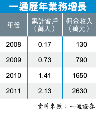 一通自08年推5元一單刁後,即使宣傳欠奉,客戶人數卻累升11倍,佣金收入更漲19倍。宓光輝指,市場實際反應較他當初想像的大得多,但亦證明低佣有市,「當市場有需求,就好似如有天助咁,唔需要你夾硬揠苖助長」。